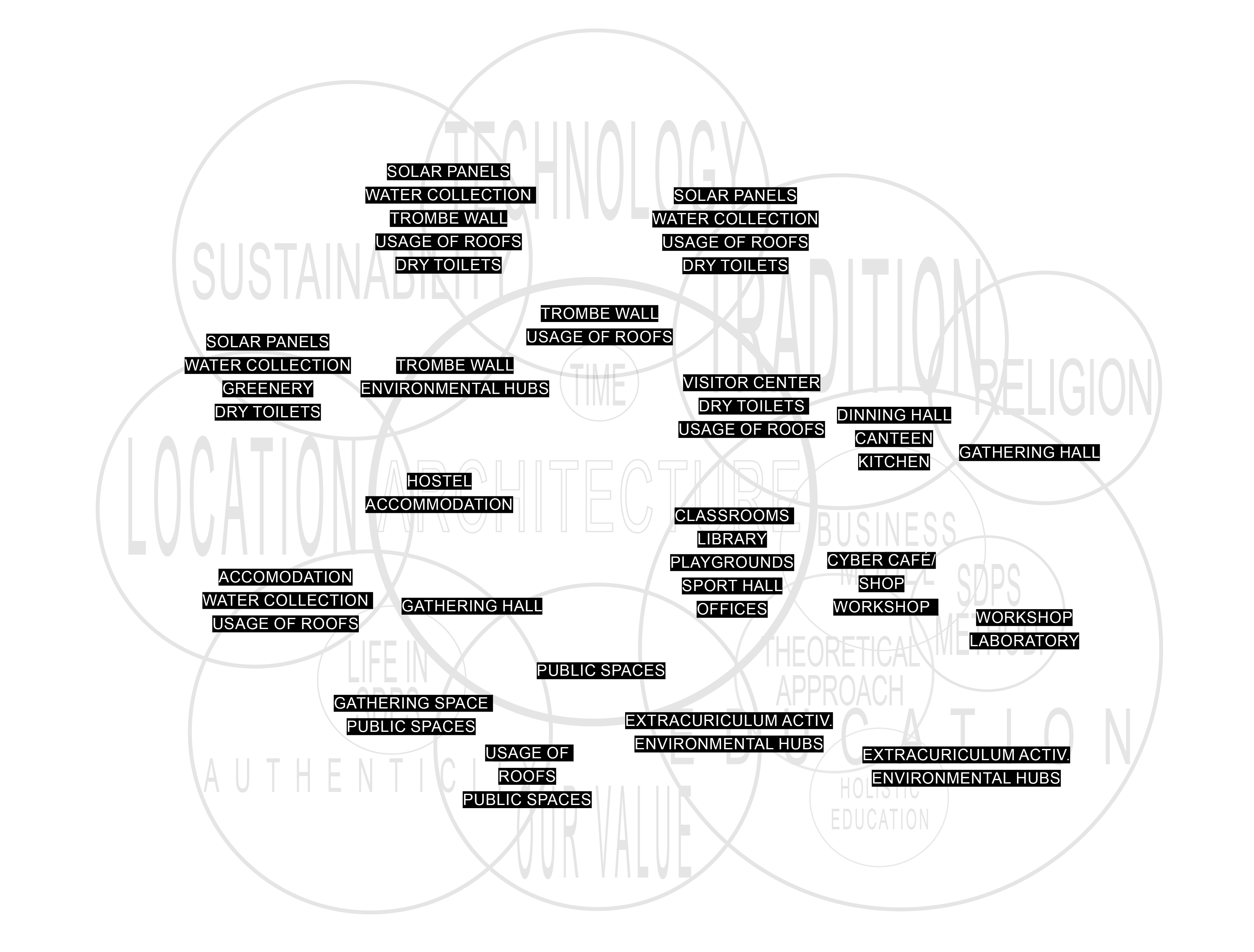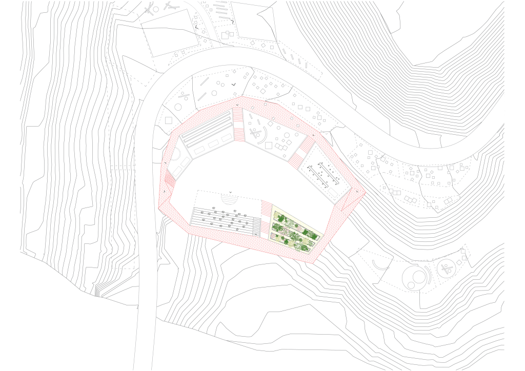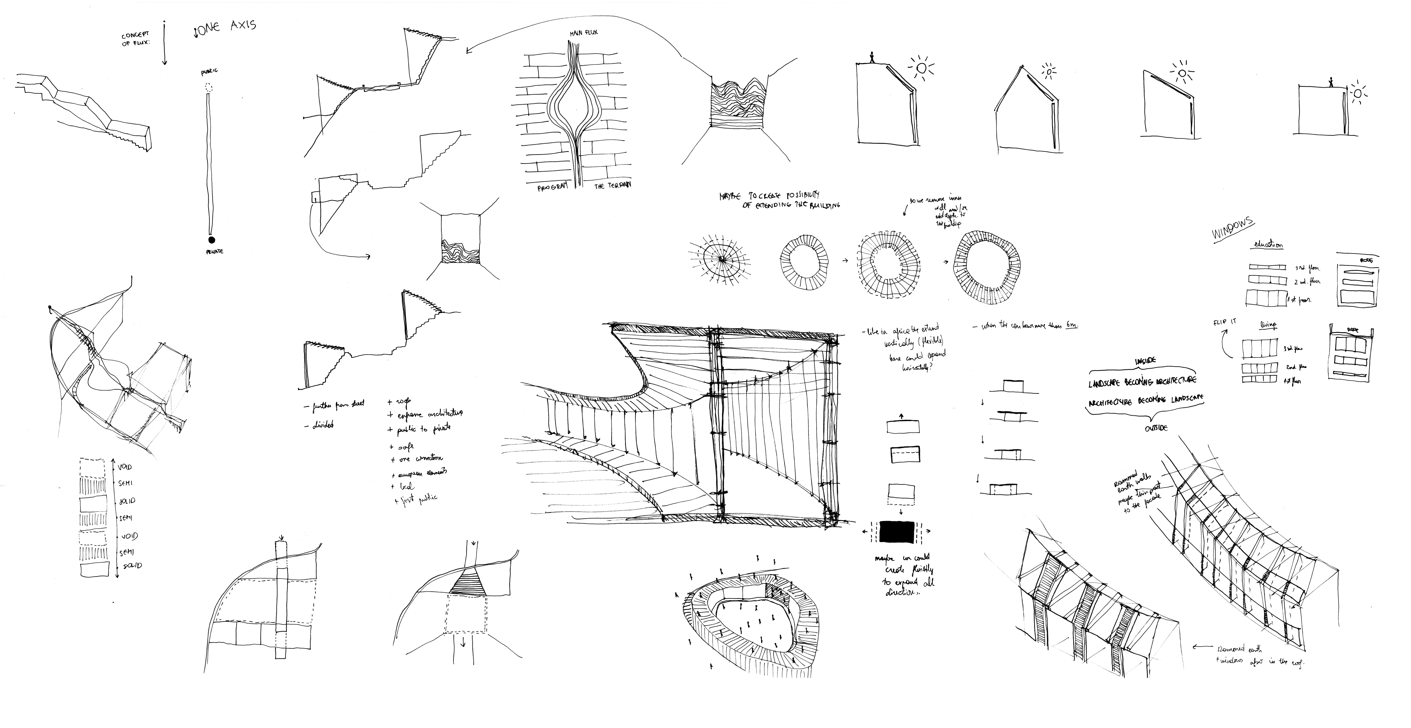 landscape embodied through the urban settlementsplugged in buildings to the terrain, work against the nature window: important element of the local architecturefluxes of people moving through the buildings, as a cell that has open and closed spaceswhat if the gathering space becomes part of the terrain and the fluxes are moving towards it?what if the horizontal path becomes vertical, like an exploration path through the site?what if we implement architecture to the terrain, to make it adaptive and reactivewhat if we pump the water to the highest point and then distribute it thtough the sitewhen circulation dictates architecture and it all become one organismwhat if we use the roofs to collect water, which would create ponds in the courtyardextreeme urban condition: mountain, valley with the greenery and rivermonastery on the top of the mountain with the village laying beneath itwhat if we enframe the nature with architecture?the growth of the village with integrated public spaces and the urban connectionswhat if the stairs become a public space or a roof?what if the whole site is connected and works as an organism, from public to privatewhat if one continuous element becomes the floor, roof, wall and an opening? rythm: the void, in between space and solid, expression through the materialityarchitecture reacting to the environment and creating a city, as a new lifestages of the building process: marks on the ground as a public space, to the volumerammed earth roof with glass in front, to heat the interiorinverted stairs with integrated building